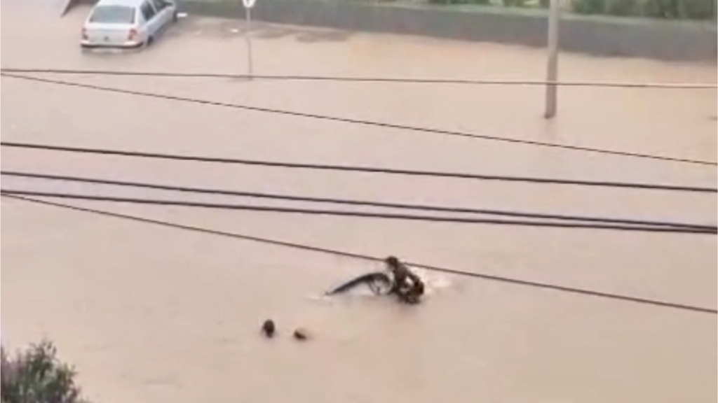 Nas imagens, é possível ver a força da água tomando conta da via. O motorista perde o controle do carro e, logo em seguida, a correnteza começa a empurrar o veículo em direção à valeta. Nesse momento, os ocupantes demonstram desespero e tentam deixar o automóvel rapidamente.