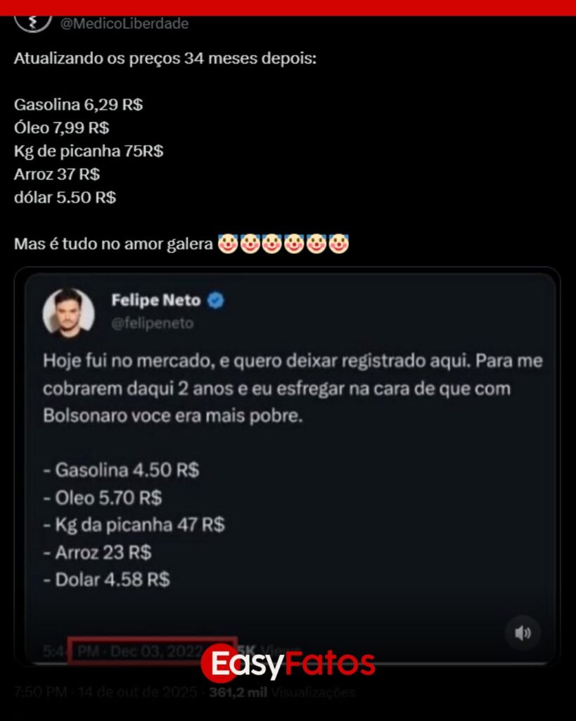 A internet tem memória longa — e, às vezes, implacável. Um exemplo claro disso vem do influenciador Felipe Neto, que publicou em dezembro de 2022 uma lista com preços de produtos e combustíveis no fim do governo Bolsonaro. Na época, ele prometeu “esfregar na cara” de quem duvidasse que os brasileiros ficariam mais ricos nos anos seguintes.